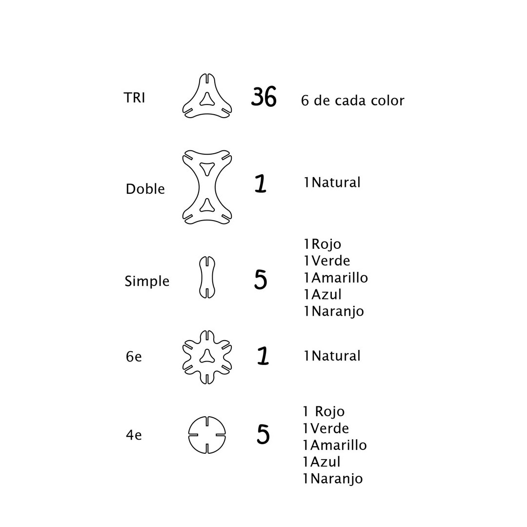 • Color piezas: Naranjo, verde, rojo, amarillo, azul y madera natural