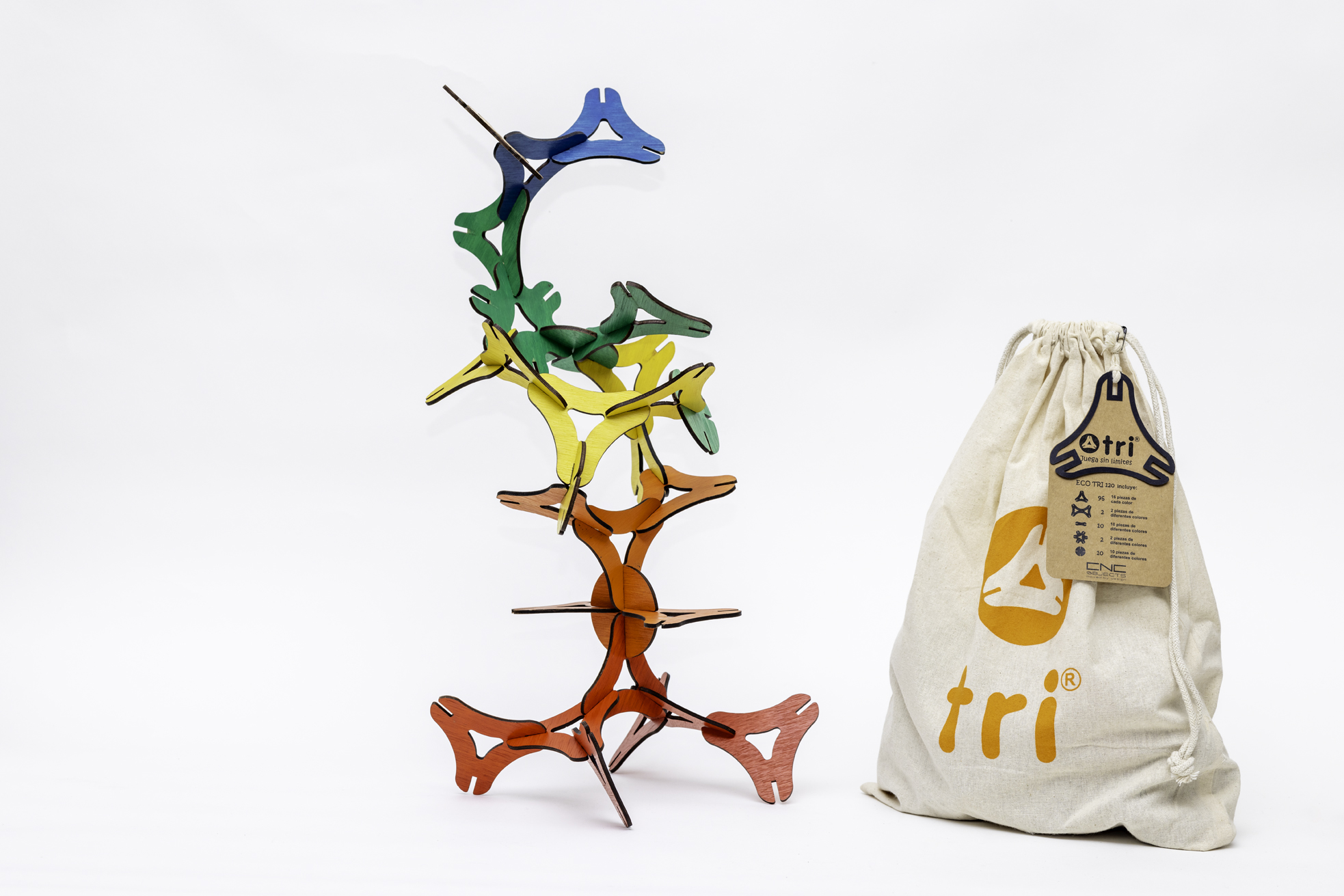 TRI es un juego de construcción con piezas de madera que permite crear formas complejas y únicas. Combina la tradición de juguetes de madera con innovaciones en diseño, color y sostenibilidad. Es tanto un juego creativo como un objeto de diseño, ideal para amantes del arte y educativo, promoviendo habilidades como la motricidad, toma de decisiones, imaginación y concentración. Explora conceptos de geometría y equilibrio, con piezas del mismo tamaño en seis colores atractivos y conectores de varias formas para ampliar las opciones de construcción.